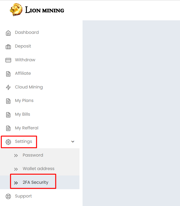 1. Open the https://www.lion-miner.com/, go to Dashboars > settings > 2FA Security